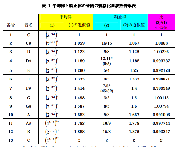 これに準ずると、各半音の間隔(割合)が位置によって異なってくるので