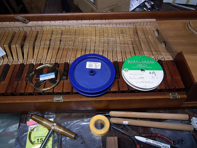 最低音部CとF(ショートオクターブだから)の2音分の、ヒッチピンを左のケース側にギリギリ移動して、After-Lengthを広げました。そして、この部分のヒッチピン・ブレース(ライナー)を少し掘り下げて、一列分のリスティングを巻けるようにしました。この2音が大分改善されたようです。