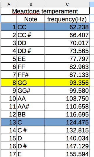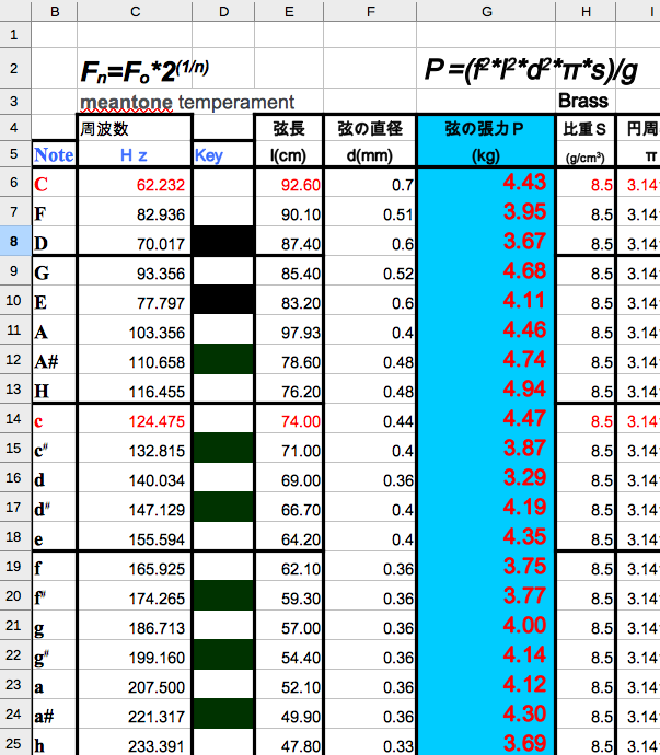 クラヴィコード のミーントーンの周波数を割り出し、弦のゲージを一応決定しました。