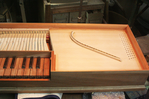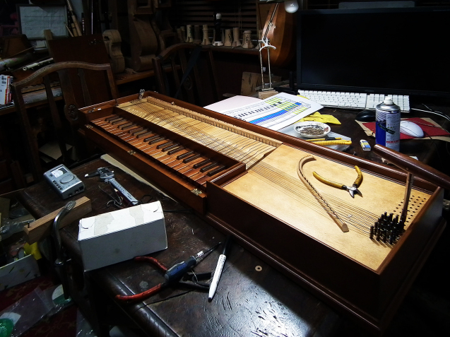 製作中のクラヴィコード ですが、やっと弦を張り終えました。初めはショートオクターブの